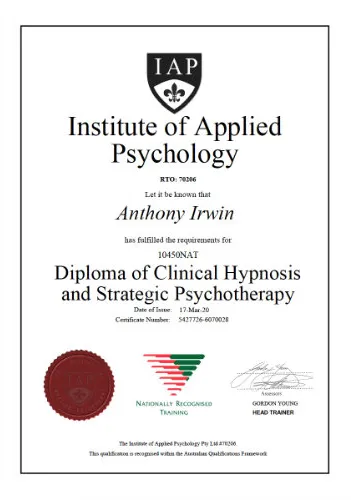 I have done a dedicated course in Clinical Hypnosis and Strategic Psychotherapy with the Institute of Applied Psychology that is a Government Accredited Tertiary Qualification that exceeds the education and training requirements of all Hypnotherapy Associations that are recognised by the Hypnotherapy Council of Australia the peak industry body in Australia for Hypnotherapy.
